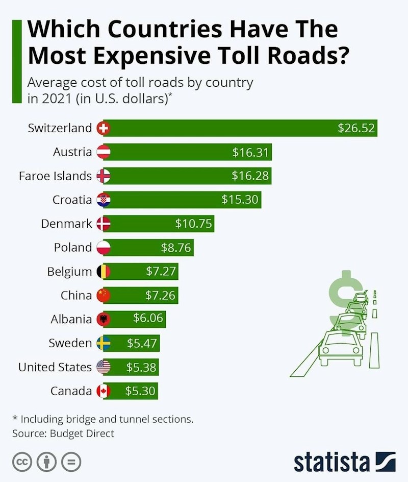 Ugledni web za prikupljanje i vizualizaciju podataka, Statista.com, na svom službenom Twitter profilu objavio je popis zemalja s najskupljim cestarinama na svijetu.