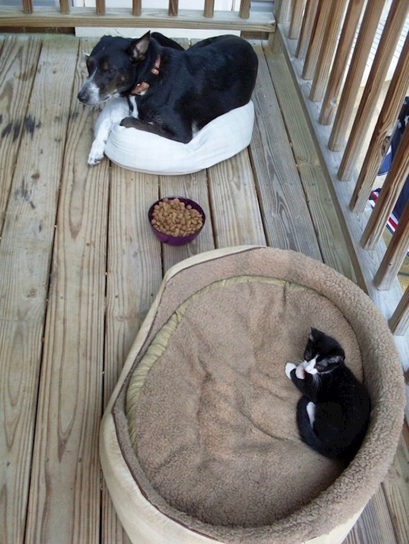 Kako to obično biva, mačke su i u ovom slučaju pobijedile i dokazale da su šefice. Ovi jadni psi ne mogu napraviti ništa drugo nego tužno gledati svoje vlasnike dok mace šefice uživaju u njihovim krevetićima...
