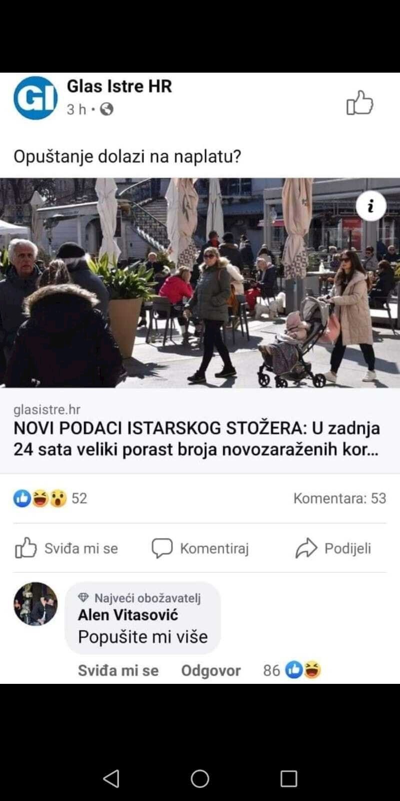 Svoje nezadovoljstvo situacijom Alen je već nekoliko puta javno isticao, a nakon današnje objave Glasa Istre o novom rastu broja slučajeva očito se više nije mogao suzdržati pa je na prilično NSFW način prokomentirao novonastalu situaciju.