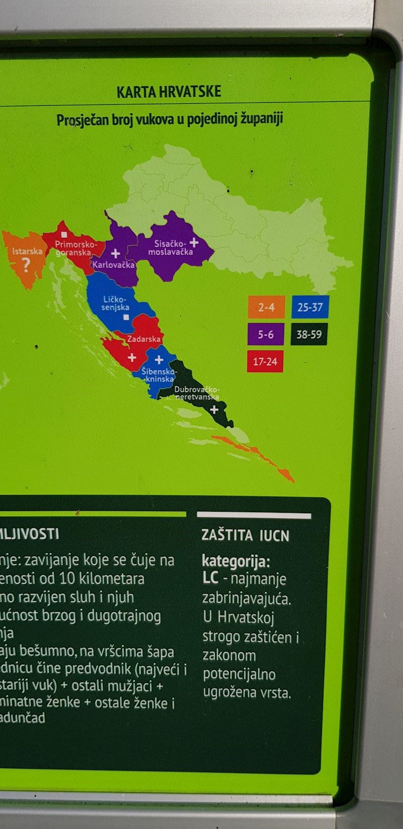 U osječkom zoološkom vrtu nalazi se karta Hrvatske koja prikazuje populaciju vukova po županijama. Broj vukova je možda i točan, ali županije definitivno nisu.