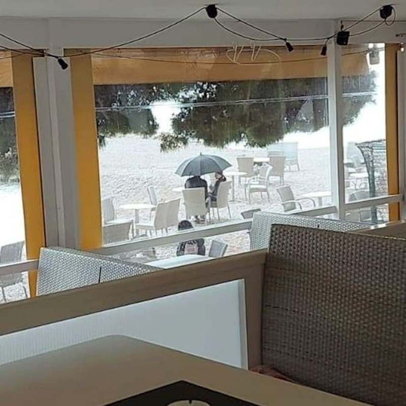 Malo kiše u Dalmaciji može ritual ispijanja kave pretvoriti u noćnu moru. Uz trenutne epidemiološke mjere u ovakvoj situaciji treba pronaći natrkrivenu terasu na otvorenom prostoru. Ipak, ovaj duo unatoč kišnom vremenu dobro se snašao!
