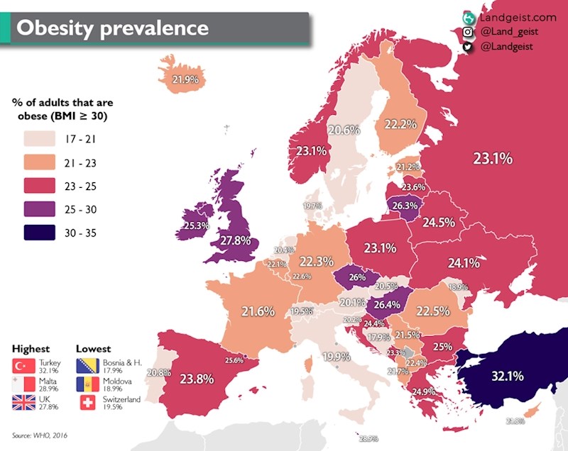 Ova karta Europe bilježi postotak pretilih odraslih osoba u zemljama Europe. Nažalost, Hrvati ne stoje baš dobro, dapače nalaze se pri gornjoj strani ljestvice. Naime, svaki četvrti odrasli Hrvat ima višak kilograma. Podatak koji je zaista zabrinjavajuć, posebno kada uzmemo u obzir razne bolesti koje nam prijete zbog prekomjerne težine. Prema Europskoj strategiji za kontrolu i prevenciju kroničnih nezaraznih bolesti prekomjerna tjelesna masa i debljina su rizični čimbenici za nastanak pet danas vodećih kroničnih nezaraznih bolesti: kardiovaskularnih bolest, šećerne bolesti tipa 2, kronične opstruktivne plućne bolesti, nekih sijela tumora te mentalnih poremećaja. U odrasloj populaciji u Hrvatskoj među osobama s pozitivnom anamnezom moždanog udara prekomjernu tjelesnu masu ima 66 % muškaraca i 75 % žena, među osobama s povišenim krvnim tlakom 78 % muškaraca i 74 % žena, a među osobama sa šećernom bolesti tip 2 79 % muškaraca i 84 % žena. Za razliku od nas, naši susjedi iz BiH su zemlja s najnižom stopom pretilih osoba. Bravo za susjede.