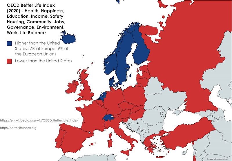 Internetom ovih dana kruži zanimljiva mapa koja pokazuje usporedbu kvalitete života u SAD-u i brojnim europskim državama. Usporedba je temeljena na OECD-ovom Indeksu kvalitete života koji u obzir uzima podatke poput očekivanog trajanja života, broja zdravih godina, osjećaja sreće, obrazovanja, prihoda, sigurnosti, nezaposlenosti, zagađenosti okoliša, balansa poslovnog i privatnog života itd.