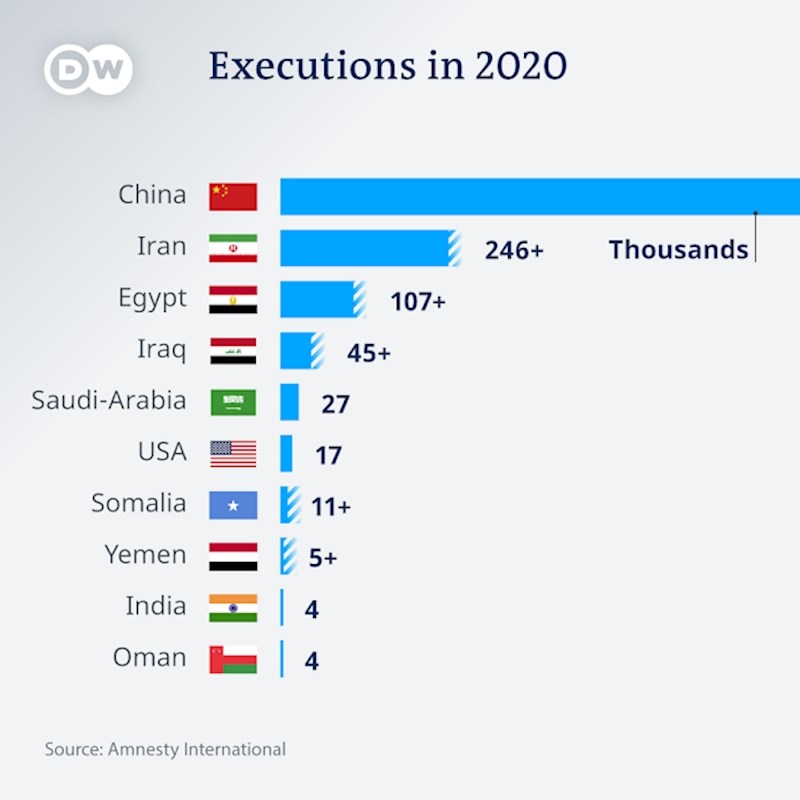 Ekipa iz Deutsche Wellea objavila je grafiku koja prikazuje poredak država koje su pogubile najviše ljudi u 2020. godini.