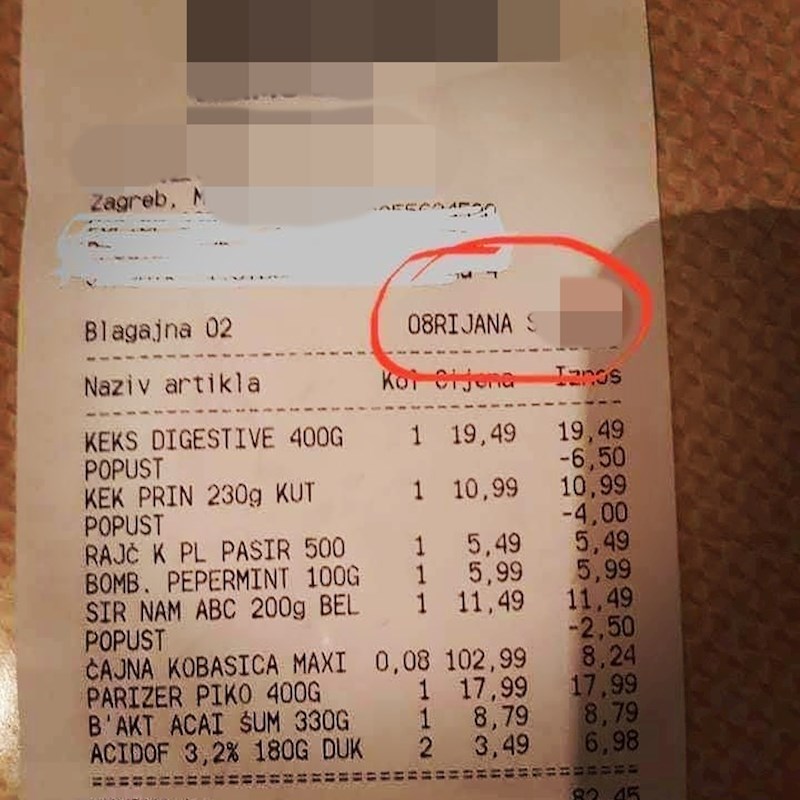 Netko je na Facebooku podijelio račun koji mu je izdan u jednoj trgovini. I to zbog vrlo nezgodne pogreške koja je malo izmijenila blagajničino ime. 🤣