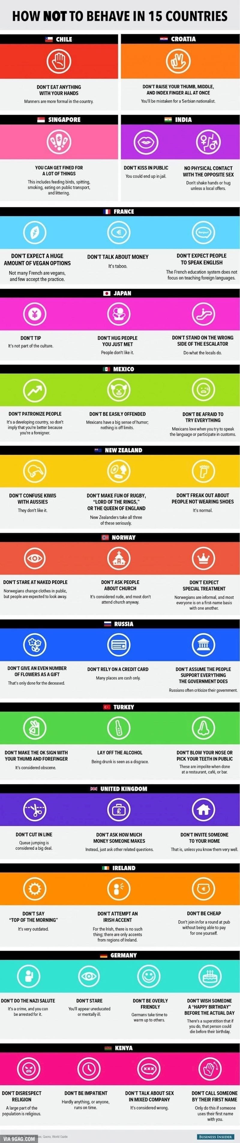 Netko se potrudio i složio veliku grafiku s popisom stvari koje nikad ne biste smjeli raditi u 15 svjetskih država jer ćete vjerovatno dospjeti u probleme ili će vas barem jako čudno gledati.