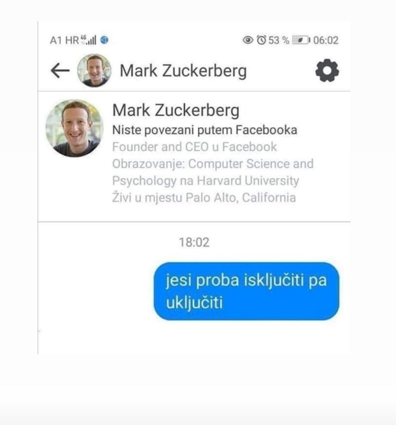 Mnogi su jučerašnje popodne proveli u ponovnom pokretanju mobitela, isključujući i uključujući routere, provjeravajući mobilne podatke. Nikome na prvu nije palo na pamet da će u isto vrijeme pasti i Facebook i Instagram i WhatsApp, pa im je bilo logičnije da je problem u njihovim uređajima ili signalu.