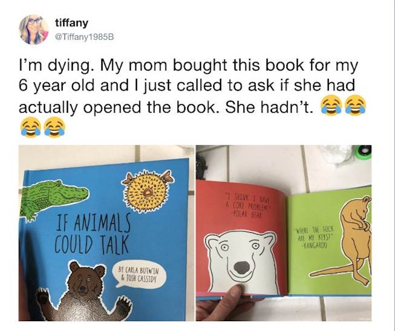 Jedna baka kupila je svojoj 6-godišnjoj unuci knjigu "Kad bi životinje mogle govoriti". Učinila joj se simpatična, duhovita i primjerena njezinoj unuci, inače velikoj obožavateljici životinja. Djevojčica je netom prije naučila čitati i zainteresirala se za slikovnice. No kad je njezina mama prolistala poklon koji je u kuću donijela baka, prilično se šokirala. Zašto, pogledajte sami...🤣