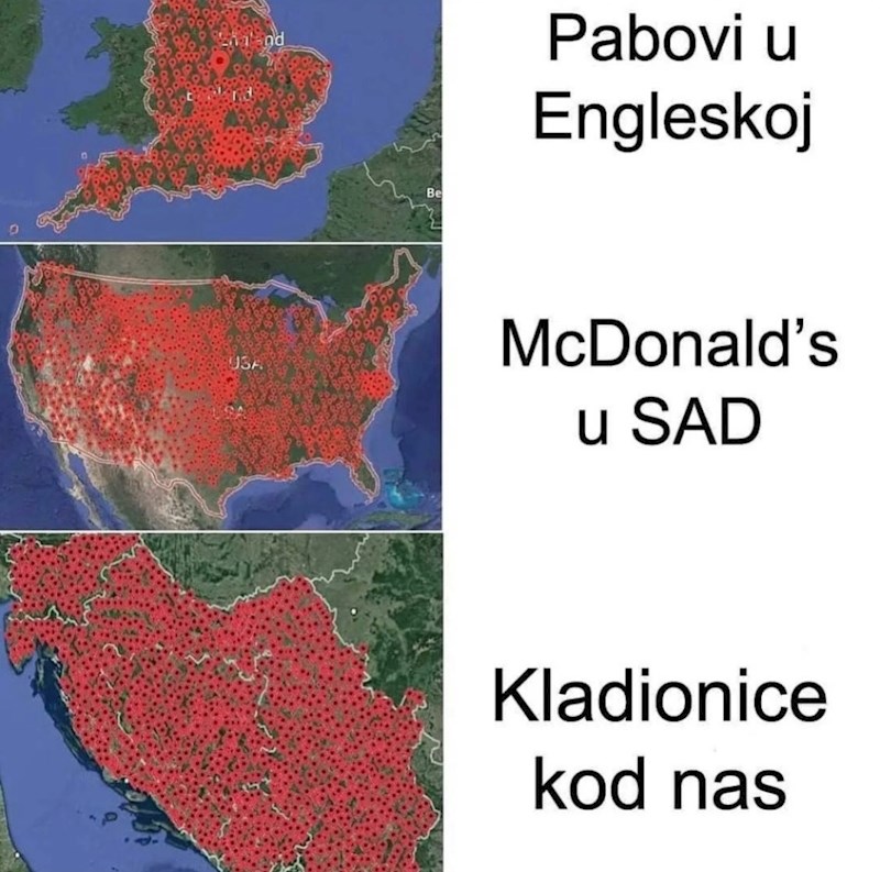Mape prikazuju zastupljenost omiljenih mjesta okupljanja ljudi u svijetu i kod nas. I dok se UK zacrvenila od lokacija pubova, u SAD-u je McDonald's ostavio jako malo slobodnog mjesta na karti. Na Balkanu se jedva nazire točkica zelene boje, pogledajte zašto!