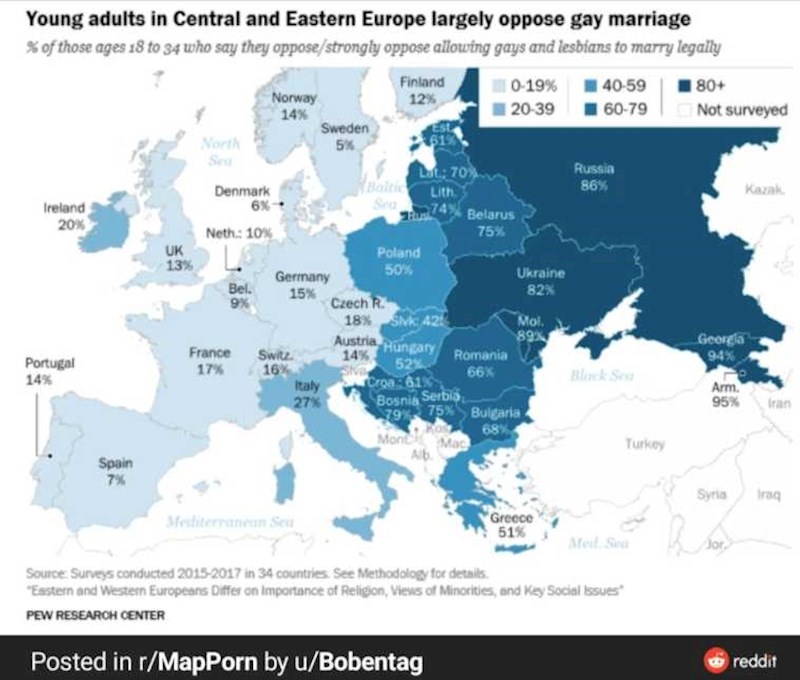 Mapa prikazuje postotak mladih koji se protive istospolnim brakovima, pogledajte kako stoji Hrvatska