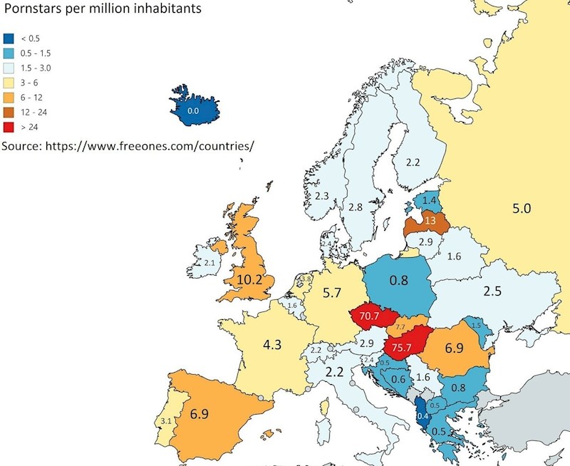 Prema prikazanim podacima, Mađarska i Češka u debelom su vodstvu, a Hrvatska je, očekivano, pri samom dnu kad je broj pornozvijezda u pitanju. Ipak, Island je tu definitivno izgubio. Ili pobijedio, ovisno iz čije perspektive. 😄
