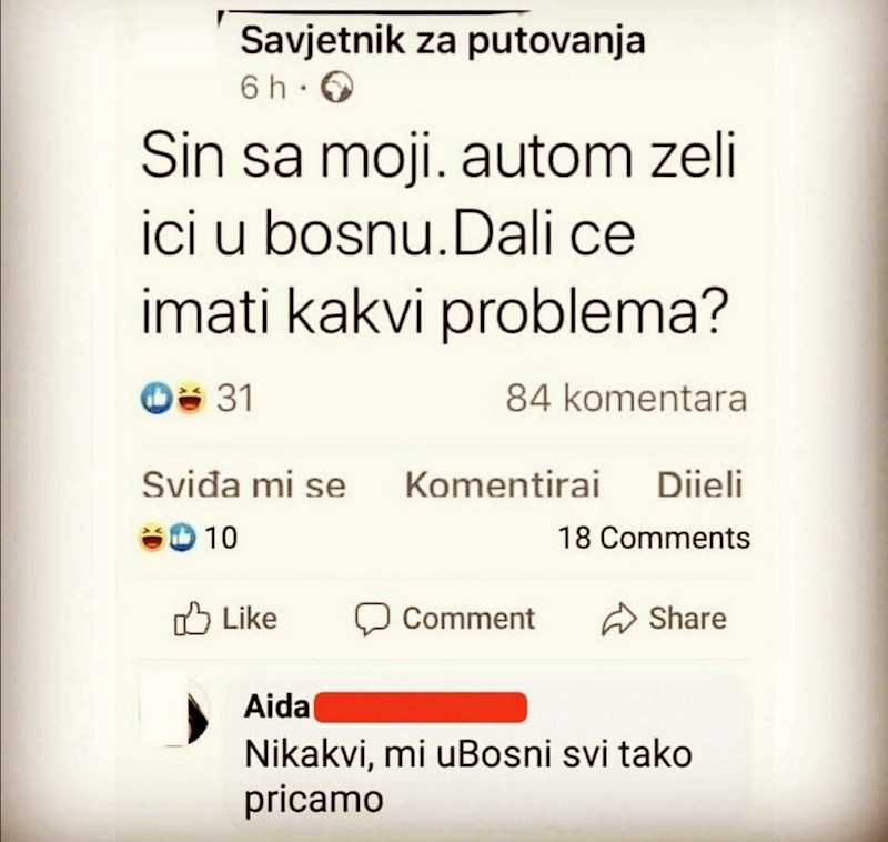 Ovom čovjeku sin je odlučio putovati u Bosnu, ali njegovim automobilom. Zato je u jednoj grupi na Facebooku odlučio ispitati je li netko imao slična iskustva, a odgovor koji je napisala Aida naprosto je urnebesan. 🤣