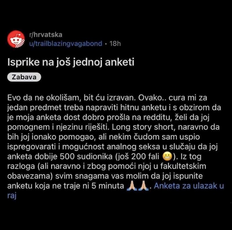 Iskrena objava ovog tipa kojom nastoji privući što više sudionika za anketu koju njegova djevojka treba za diplomski nasmijala je tisuće ljudi. Evo zašto je on tako motiviran da pomogne svojoj odabranici...😁