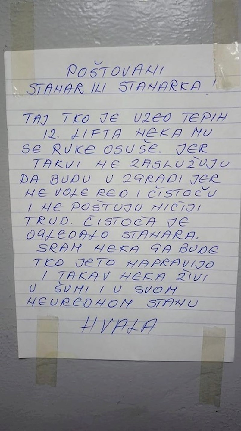 Stanarku jedne zgrade poprilično je uzrujala činjenica da je netko iz kabine lifta maznuo tepih. Kako bi se obračunala s nepoznatim počiniteljem ostavila je ljutitu poruku u kojoj mu je iskreno rekla sve što ga ide. 😆