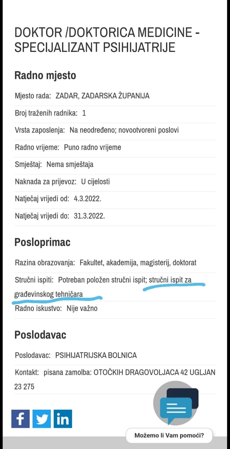 Oglas za specijalizanta psihijatrije postao je hit zbog apsurdnog prohtjeva bolnice, morate vidjeti