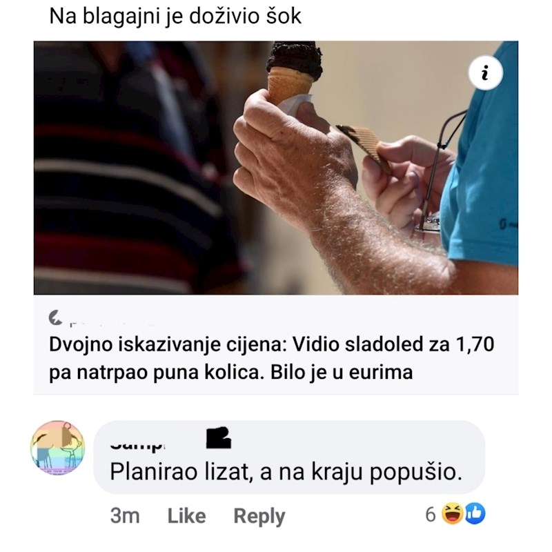 Danas svi dijele priču o tipu koji je mislio da je uhvatio sladoled na super akciji, da bi ga na blagajni dočekao hladan tuš- cijena je bila izražena u eurima! Proces prilagodbe na dvojno iskazivanje cijena tek je počeo pa je ova greška potpuno razumljiva i mogla se svakome dogoditi, ali morate priznati da je i vas nasmijala!