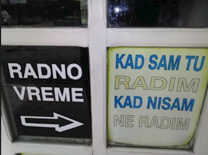 Jedan obrtnik iz Srbije okačio je na ulazu u svoj lokal tablu s radnim vremenom koje je nasmijalo mnoge prolaznike, a uskoro i postalo hit na društvenim mrežama.