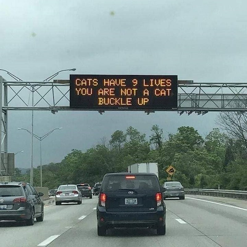 Prijevod natpisa glasio bi: "Mačke imaju devet života, ali vi niste mačke. Zavežite se". Ne znamo je li pomoglo, ali je svakako nešto što se ne viđa svaki dan.