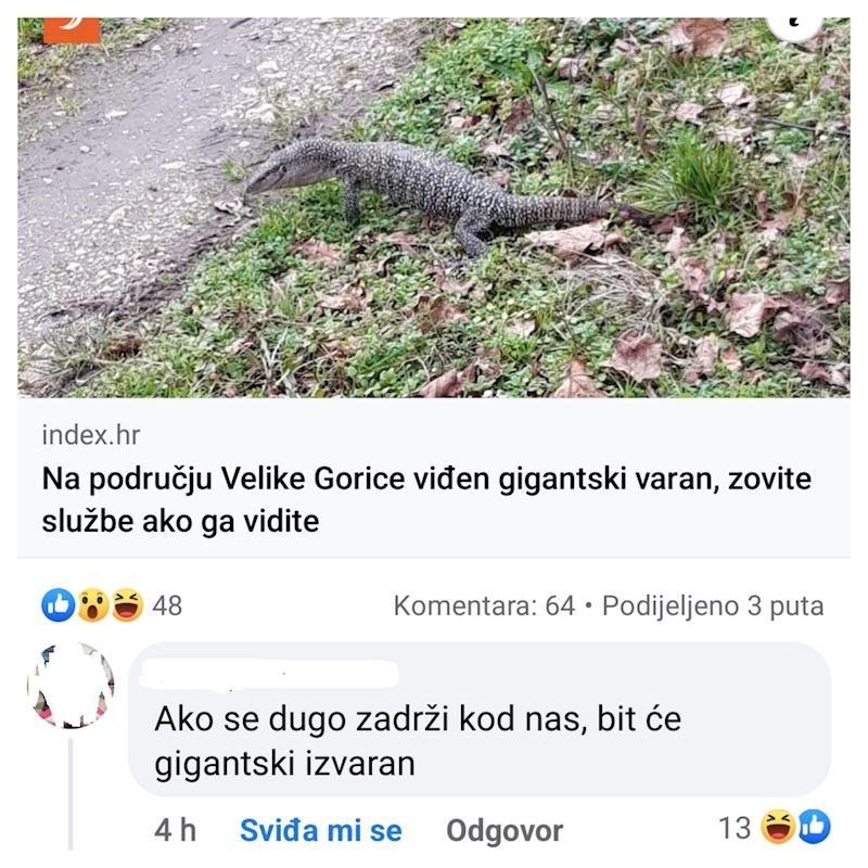 Komentar na upozorenje o varanu viđenom kod Velike Gorice izazvao je salve smijeha na Fejsu, hit je