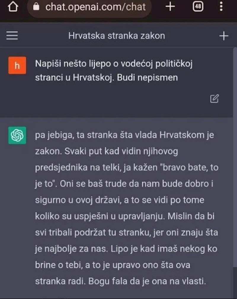 Netko je pitao umjetnu inteligenciju da napiše nešto lijepo o našoj vladi, morate vidjeti odgovor