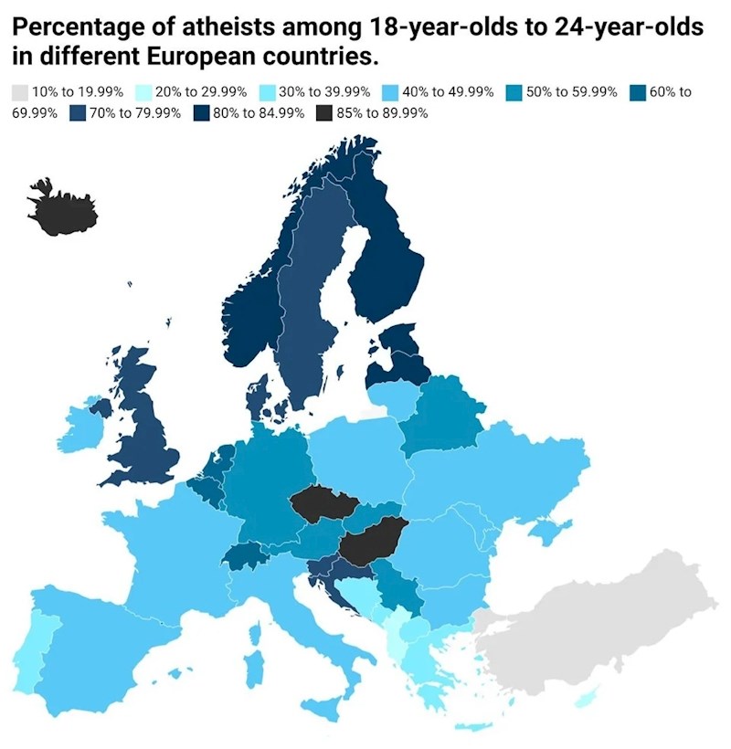 Netko je na Redditu podijelio mapu koja prikazuje koliki je udio ateista kod mlađe populacije (18-24 godine) u pojedinim državama Europe.