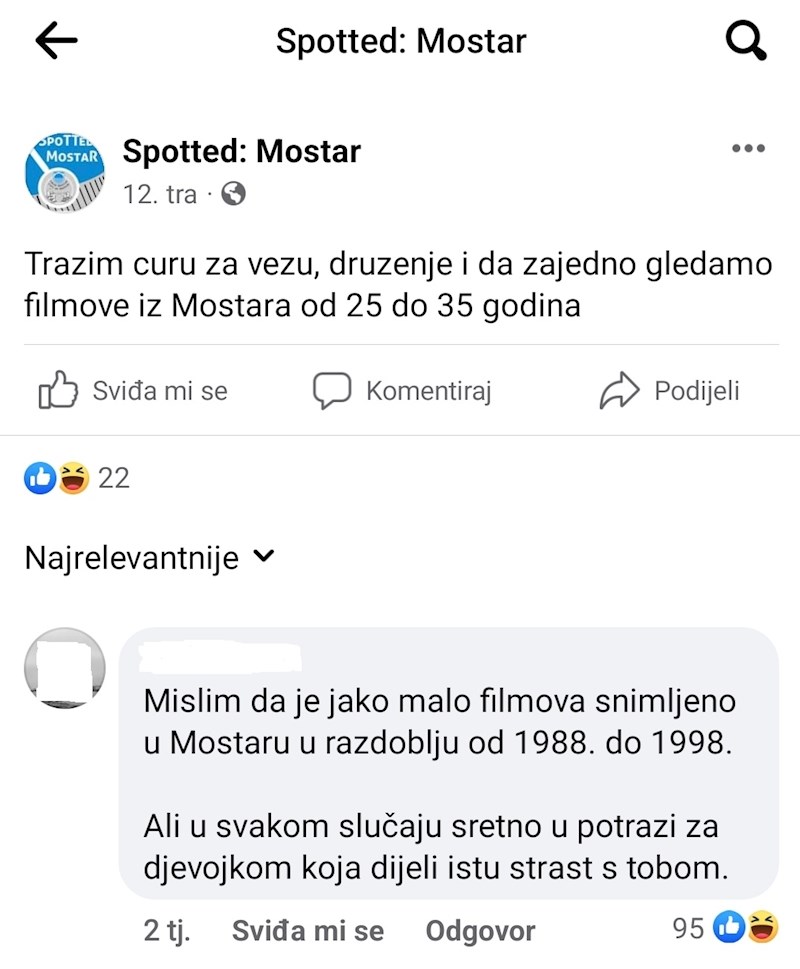 Nespretno sročena objava nekog tipa, u kojoj traži curu za druženje i moguću vezu, potakla je lavinu reakcija. Posebno inspiriran bio je autor ovog dragulja među komentarima, koji se odmah proširio regijom! Morate vidjeti!