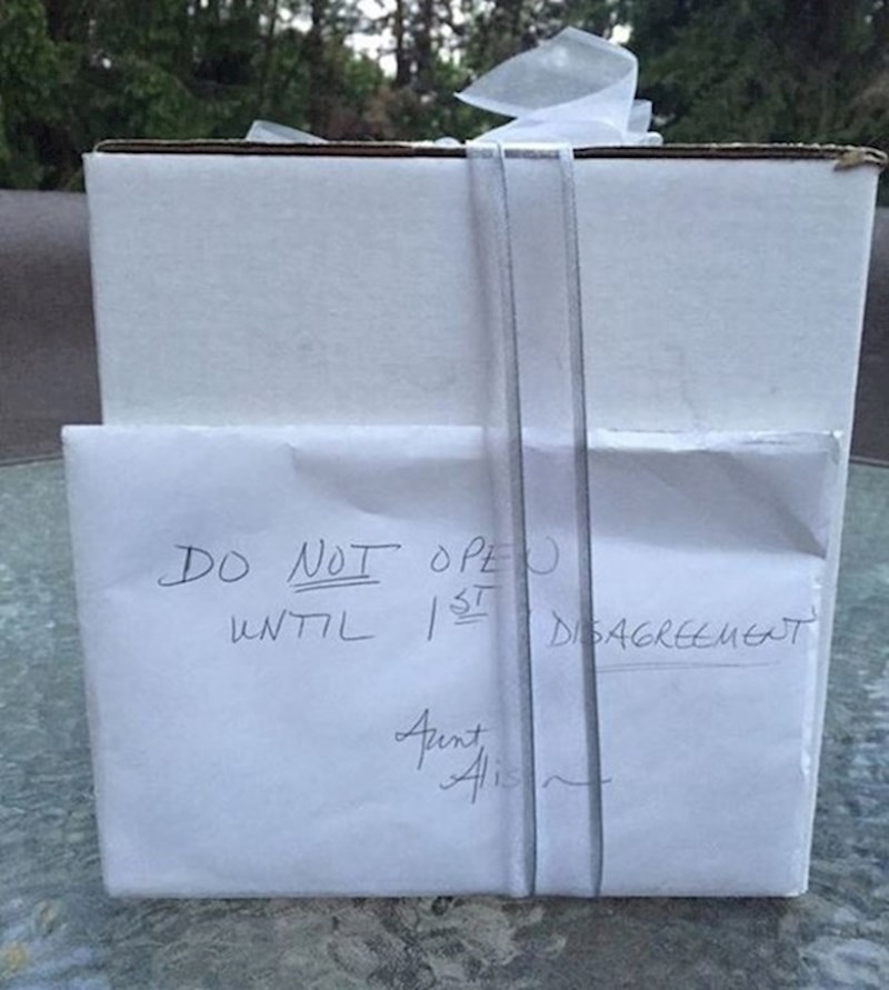 Svaki brak ima svoje uspone i padove. To je jako dobro znala i starija žena koja je mladom bračnom paru poklonila nešto posebno. Na svom poklonu napisala je "Ne otvarajte prije prve svađe", a Brandon i Kathy odlučili su poštovati njenu želju i iznenađenje čuvati za "crne dane".