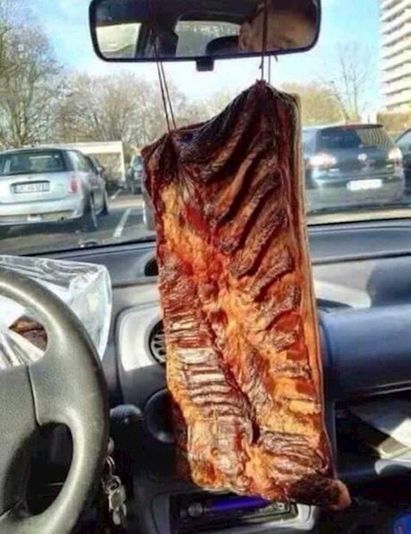 Ljubitelji dobrog zalogaja bit će oduševljeni prizorom iz jednog automobila, fotkanog negdje na Balkanu! Tip je, naime, umjesto mirisnog borića svog limenog ljubimca osvježio neobičnim rekvizitom, poprilično drugačijeg mirisa od onog na kojeg smo navikli udisati tijekom vožnji.