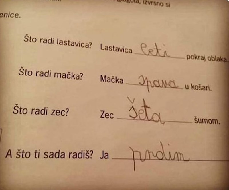 Nakon što je odgovorio na pitanje što rade određene životinje, trebao je napisati što on radi u tom trenu, a njegov odgovor je za čistu peticu! 😆
