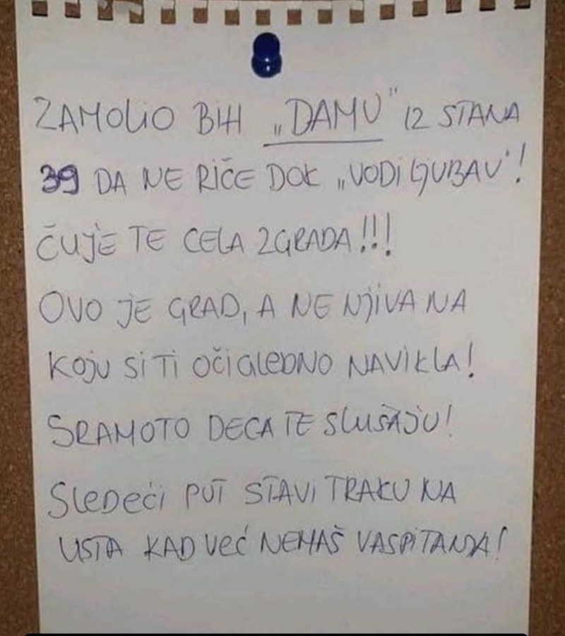 Susjedi su bijesni na stanarku zgrade zbog glasnog vođenja ljubavi, pogledajte što su joj napisali