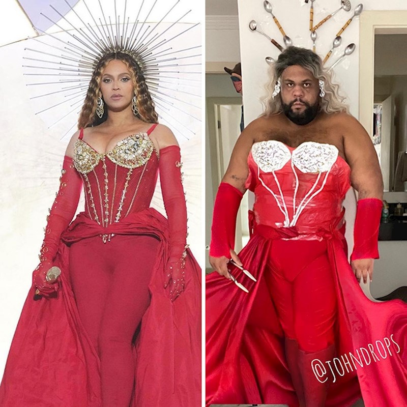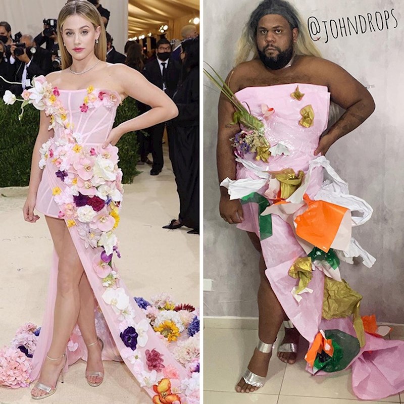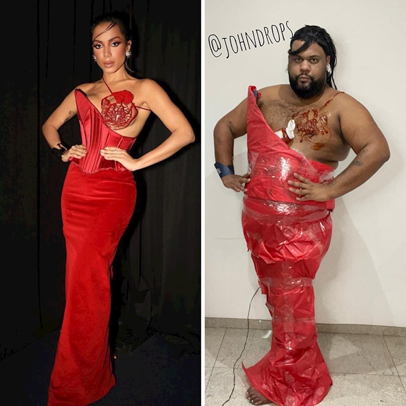 Sve je počelo kada je 30-godišnji student marketinga João Paulo Anjos gledao dodjelu nagrada VMA 2014. i primijetio da Balmainova haljina koju je nosila Kim Kardashian izgleda vrlo slično tepihu u njegovoj kući. U superbrzoj produkciji John Drops je zgrabio tepih, stavio crnu krpu na glavu i tako je nastao prvi look.