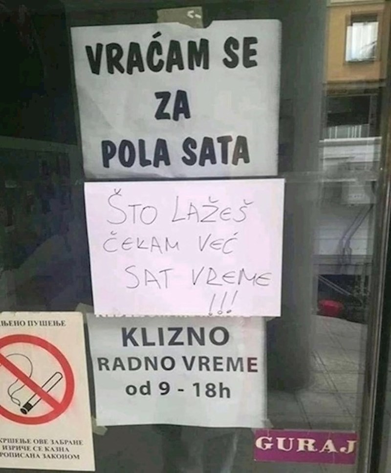 Vlasnik ove trgovine nije održao svoje obećanje. Prošlo je pola sata, a on se nije vratio. Sigurno nije očekivao da će mu netko uzvratiti ovakvom porukom.