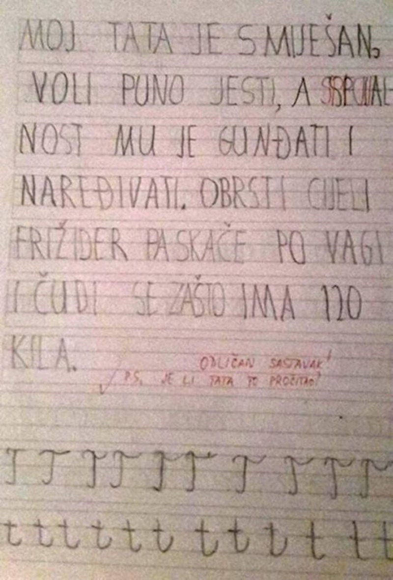Osnovnoškolci su učili slovo t i dobili su zadatak napisati sastavak na temu tate. Jedan školarac oduševio je učiteljicu, ali i nasmijao mnoge koji su pročitali genijalni sastavak!