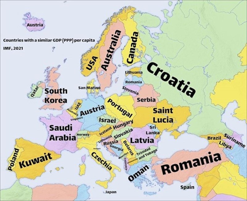 Prikazuje europske države, ali kriterij je taj da je ime zemlje ucrtano na teritorij one s kojom dijeli sličan BDP.