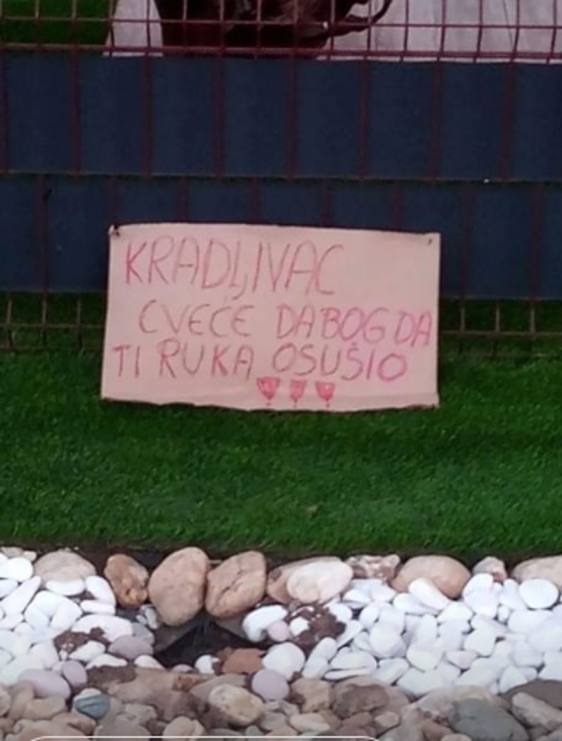 Kradljivac cvijeća dobro je iživcirao vlasnicu ovog dvorišta pa se odlučila obračunati s njim tako da baci na njega bizarnu kletvu. Fotka je, naravno, odmah postala turbo popularna na mrežama diljem regije.