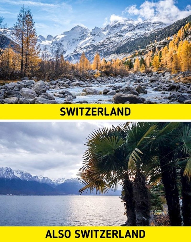 To nije niti čudno, s obzirom na sve prirodne ljepote koje ova zemlja pruža. Postoji stereotip da je Švicarska zemlja planina, krava i jodlanja. Ali u nekim dolinama blizu jezera čak rastu i palme. Ljudi tamo uzgajaju kivije i banane i možete se osjećati kao u nekoj tropskoj zemlji. 😁