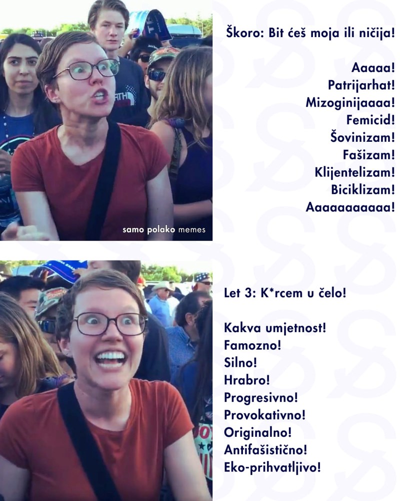 Za neupućene - woke ljevica posljednjih dana se okomilla na jednu televiziju što je za novogodišnji program dozvolila Škori da pjeva "bit ćeš moja ili ničija", a besposlena desnica uzvraća da se na televizijama uredno pušta još gora mizoginija u pjesmama Leta 3, ali se to proglašava umjetnošću.