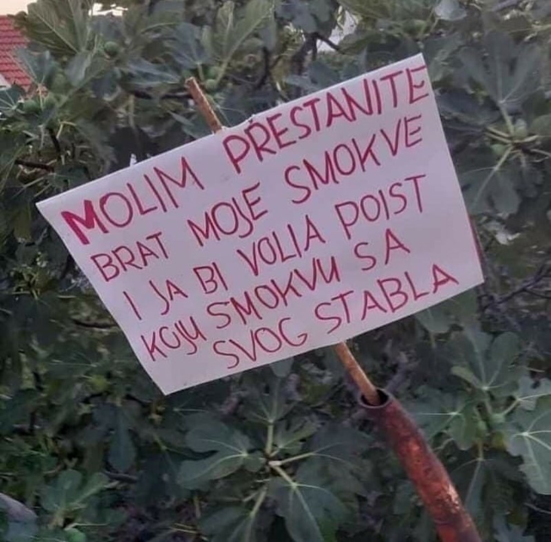 Iako smo daleko od sezone smokvi, ovih dana isplivala je stara fotka jednog natpisa viđenog u Dalmaciji prethodno ljeto. Toliko je iskren i simpatičan da samo ljudi bez duše mogu zanemariti ono što ih vlasnik smokve moli... 😄