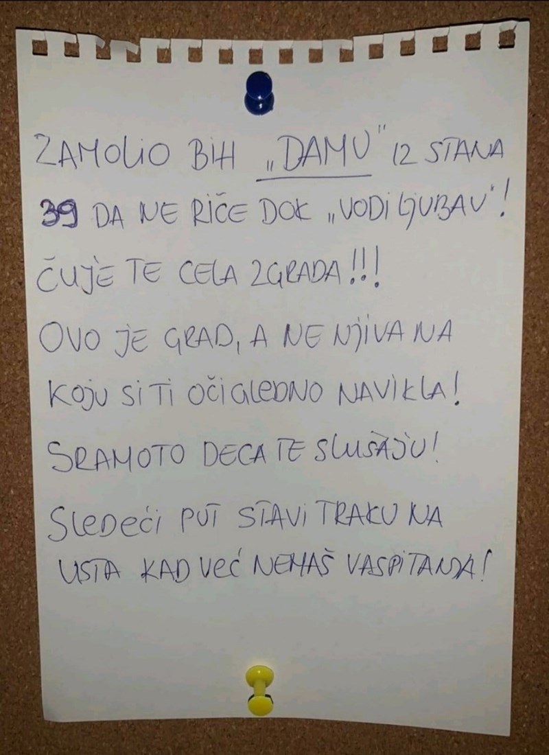 U zajedničkom hodniku jedne stambene zgrade negdje u Srbiji osvanula je poruka koja je izazvala lavinu reakcija na društvenim mrežama. Čovjek je sročio poruku u kojoj je na prilično vulgaran način opomenuo ženu iz stana 39 zbog buke koju navodno proizvodi.