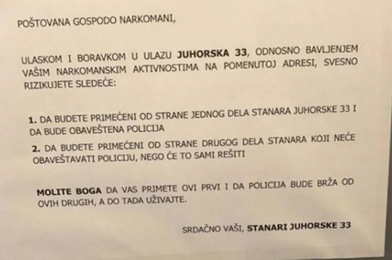 Srdačno vaši, stanari Juhorske 33", navodi se u pretećoj poruci.