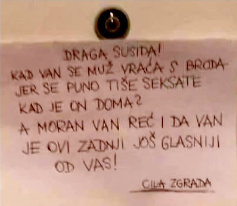 Cijelu zgradu budila je noćnim aktivnostima, a onda su joj susjedi napisali poruku. Hit je!