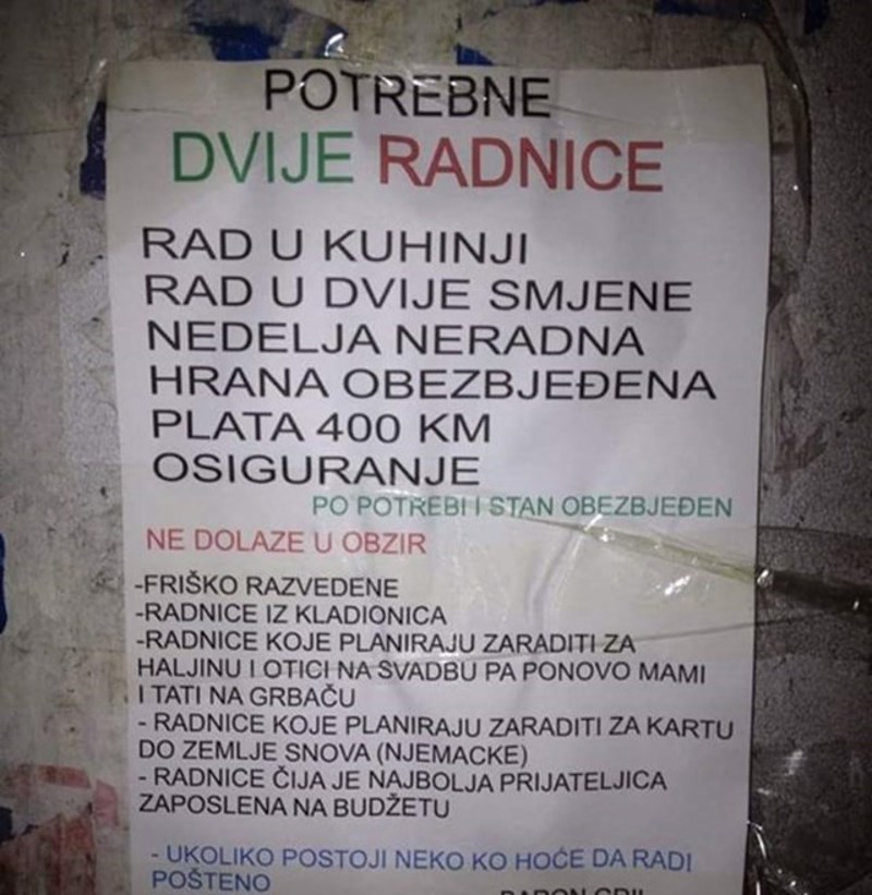 Svaki poslodavac pri odabiru radnika koje će zaposliti ima svoje kriterije, ali kriteriji vlasnika jednog restorana u BiH nisu mogli proći neprimijećeno. 😂