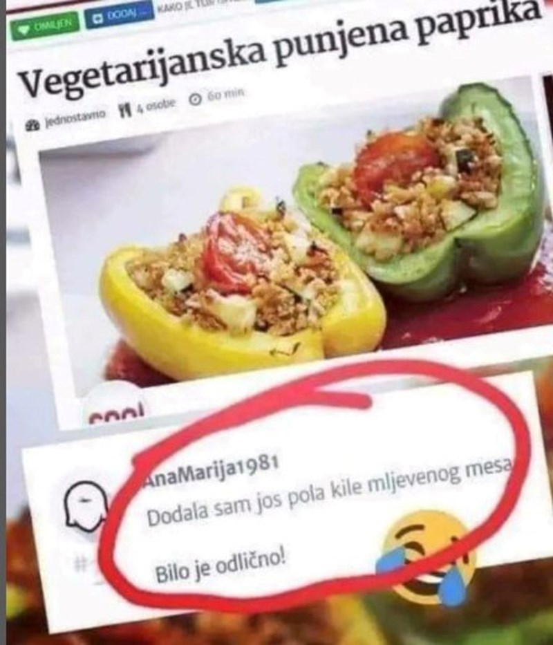 Komentar na recept za vegetarijansku punjenu papriku nasmijao je Balkan, odmah ćete vidjeti zašto