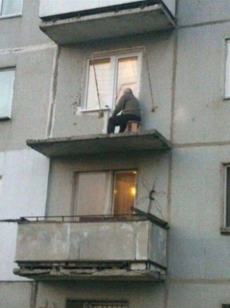 Premda ovaj balkon nema niti zaštitnu ogradu niti adekvatnu sjedalicu, ovaj je čovjek odlučio pošto poto uživati u njegovim blagodatima. 😁