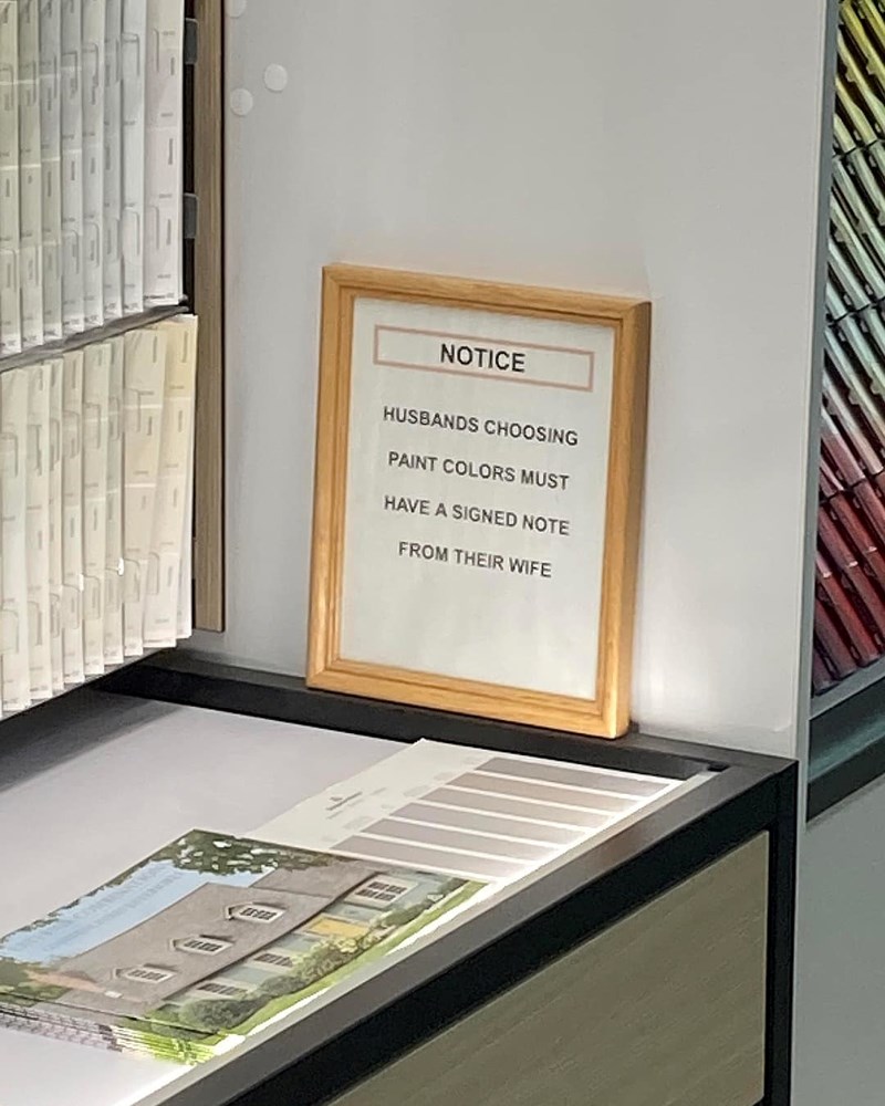 Za odabir savršene boje za zidove ili namještaj potrebno je vješto oko i dobar ukus. Najbolje to znaju djelatnici ove trgovine bojama za ličenje, a do zaključka smo došli zahvaljujući obavijesti fotkanoj u njihovoj poslovnici. Kako bi se ogradili od potencijalnih neugodnosti nakon kupnje i pokušaja povrata robe, dosjetili su se odličnog načina prevencije problema, a metodom su posebno oduševili- žene!