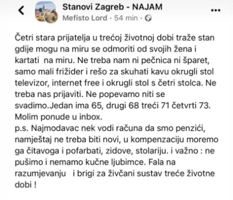 Penzioner je preko FB grupe pokušao pronaći stan, plakat ćete od smijeha kad vidite zašto mu treba