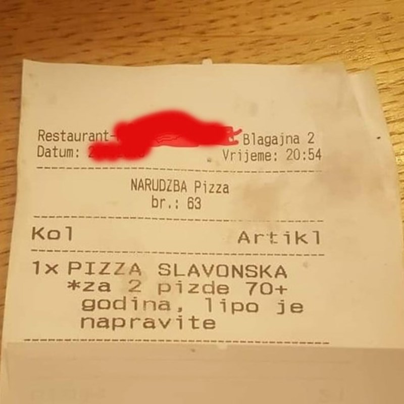 Dvije starije gospođe su u Dalmaciji posjetile restoran i naručile slavonsku pizzu. I šokirale se kad su vidjele komentar na dijelu računa u kojem je bila naznačena njihova narudžba. 😬