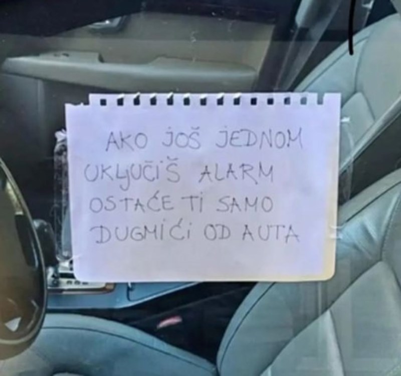 Tipu se na autu stalno iz nekog razloga stalno palio alarm, što naravno susjedima nije bilo drago. Jednom tipu je prekipjelo pa mu je na auto nalijepio poruku prijetnje koja nije mogla proći neprimijećeno.