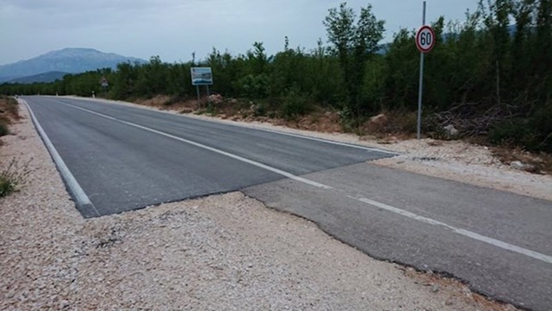 Zašto je ovakva? Zato što se lijevi dio ceste nalazi u Zadarskoj županiji, a desni u Šibensko-kninskoj koje se, očito, nisu uspjele dogovoriti je li ova cesta bitna ili nije pa su je jedni obnovili, a drugi pretvorili u makadam.