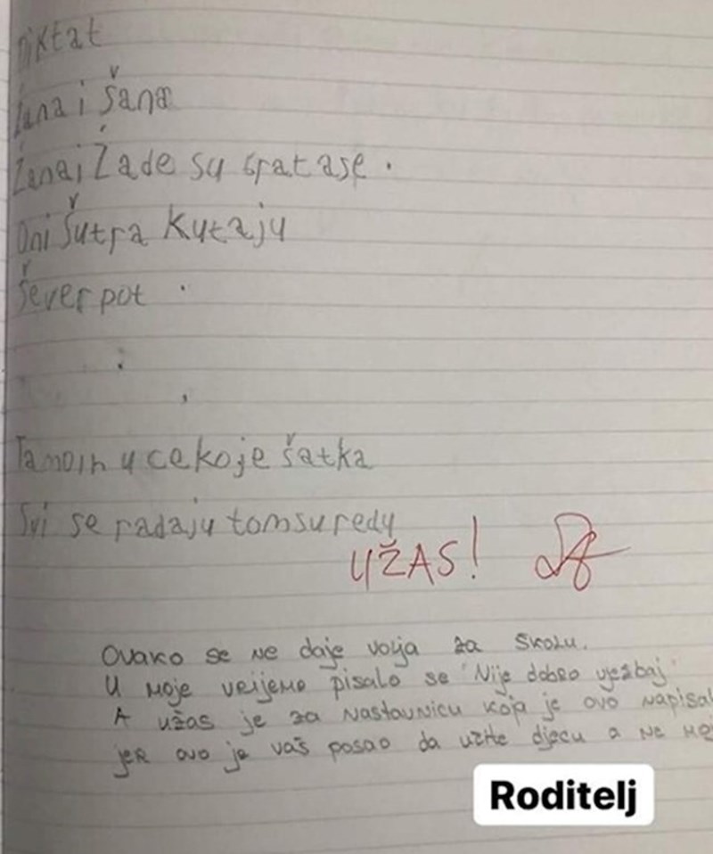 Neka djeca u školi trebaju dodatnu pomoć, no čini se da to ova učiteljica nažalost ne shvaća. Učenikovo pisanje ocijenila je komentarom "UŽAS!" iako je vrlo lako moguće da je riječ o obliku disgrafije.